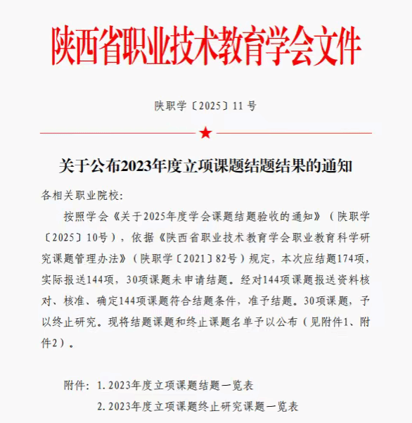 校区张军、王军龙等6位老师课题在陕西省职业技术教育学会2023年度立项课题结题中顺利结题,涵盖“三全育人”、专业群建设、课程思政等领域,展现校区在职业教育科研与实践中的扎实成果。
