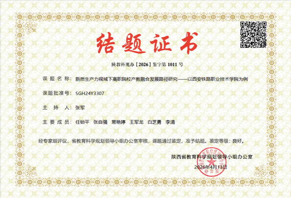 2026年第一期陕西省教育科学规划课题结题项目公布,张军老师主持的《新质生产力视域下高职院校产教融合发展路径研究——以西安铁路职业技术学院为例》项目通过专家组鉴定,顺利结题。