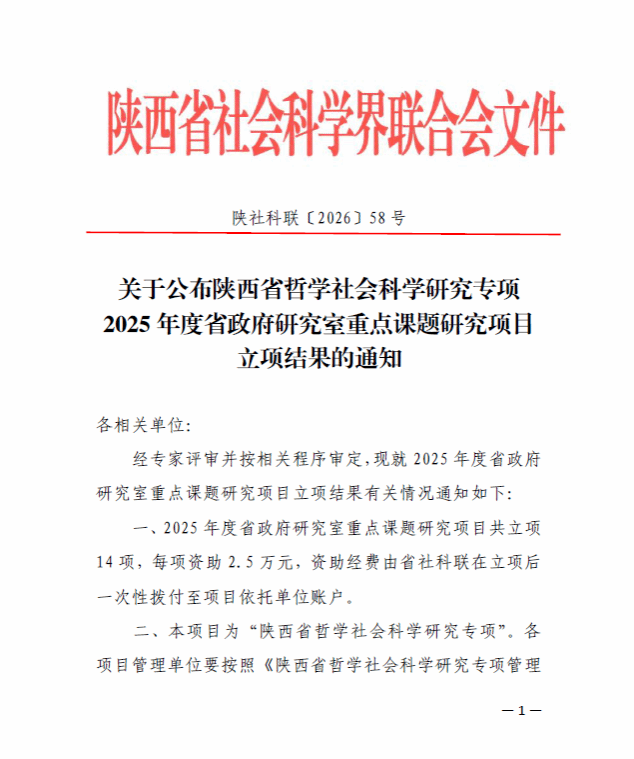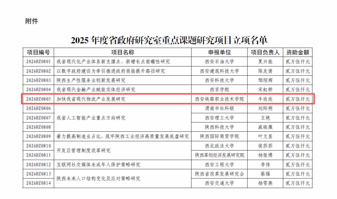 近日,陕西省哲学社会科学研究专项2025年度省政府研究室重点课题研究项目立项结果公布,牛欣欣老师主持的《加快我省现代物流产业发展研究》项目获批。
